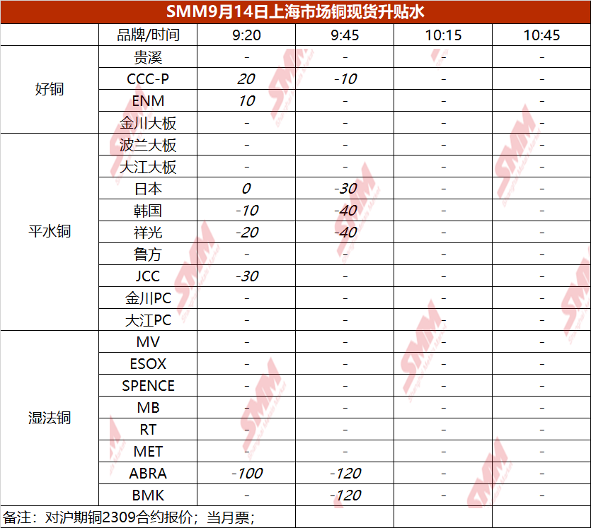 9月14日上海市场铜现货升贴水(第二时段)【SMM价格】