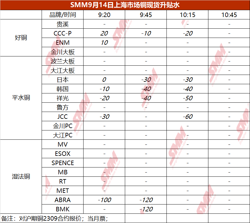 9月14日上海市场铜现货升贴水(第三时段)【SMM价格】