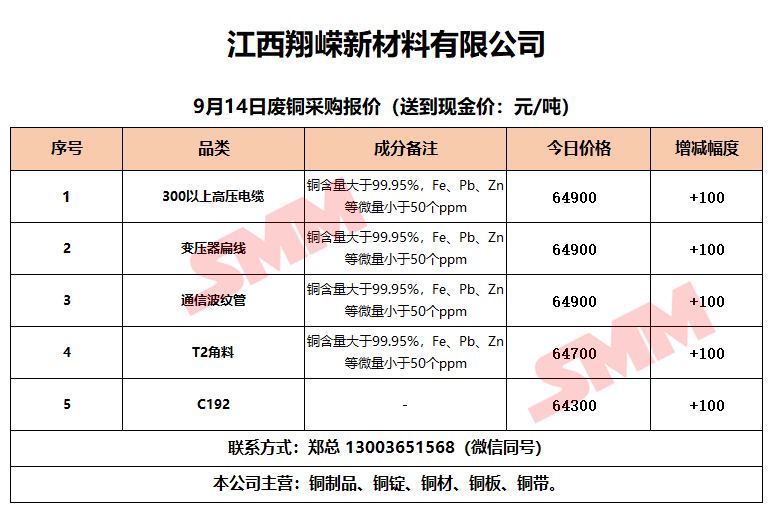 9月14日江西翔嵘新材料 废铜采购报价