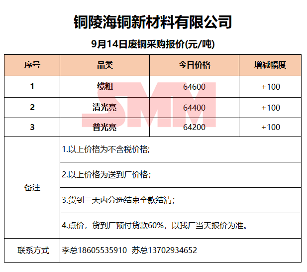 9月14日铜陵海铜 废铜采购报价