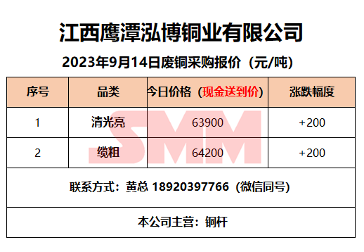9月14日江西鹰潭泓博铜业 废铜采购报价