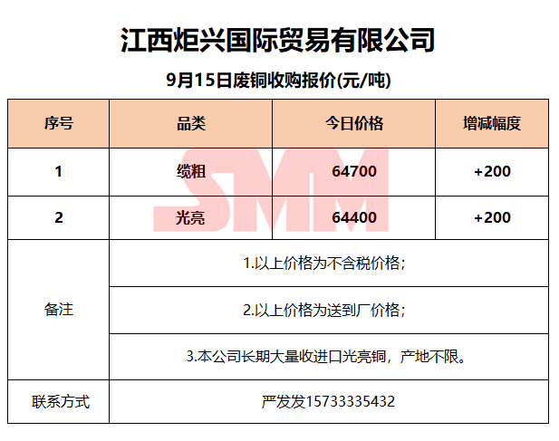 9月15日江西炬兴 废铜收购报价