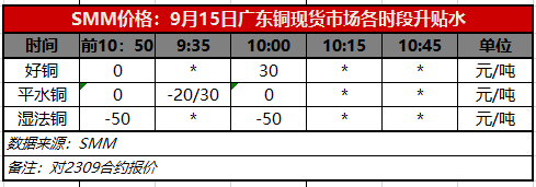 9月15日广东铜现货市场各时段升贴水(第二时段10:00)【SMM价格】