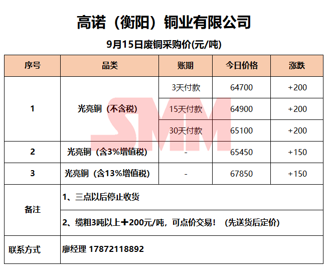 9月15日高诺(衡阳)铜业 废铜采购报价