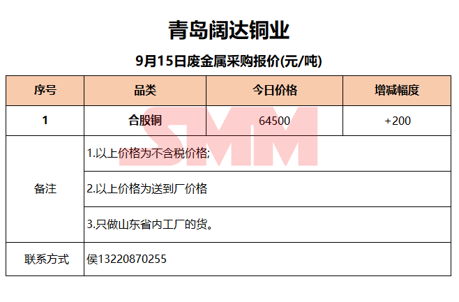 9月15日青岛阔达 废金属采购报价