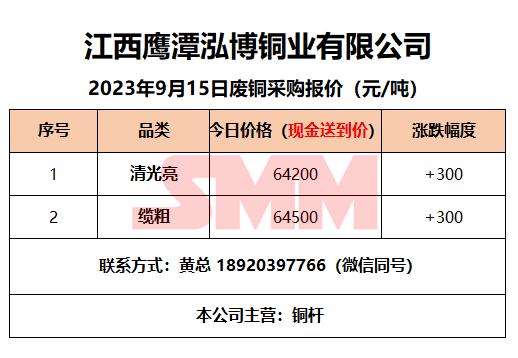 9月15日江西鹰潭泓博铜业 废铜采购报价