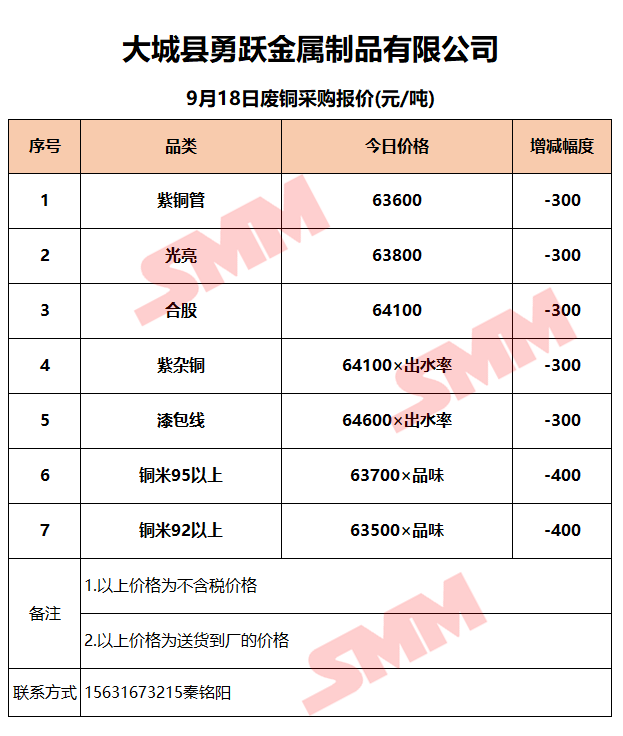 9月18日大城勇跃 废铜采购报价