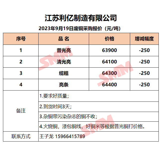 9月19日江苏利亿 废铜采购报价