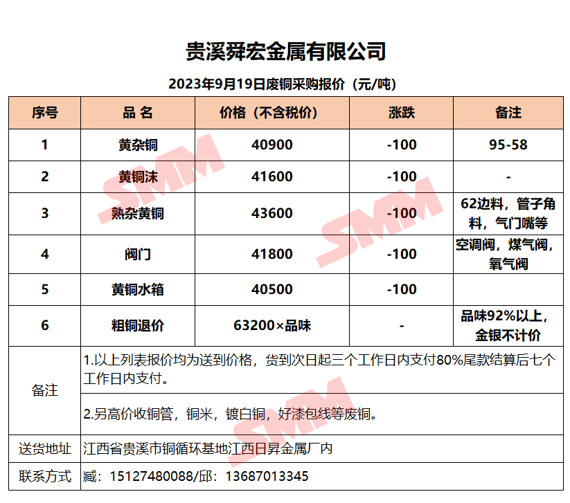 9月19日贵溪舜宏 废铜采购报价