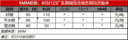 9月21日广东铜现货市场各时段升贴水(第一时段9:30)【SMM价格】