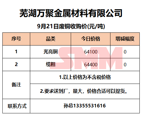 9月21日芜湖万聚金属 废铜收购报价