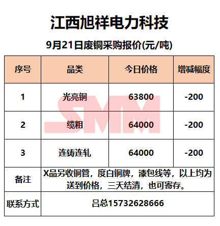 9月21日江西旭祥 废铜采购报价