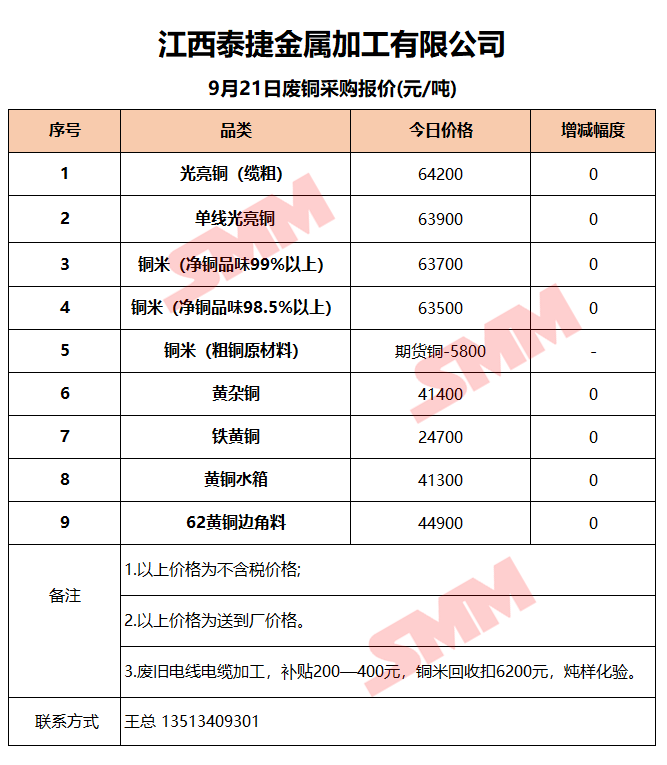 9月21日江西泰捷 废铜采购报价
