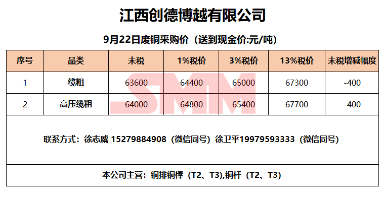 9月22日江西创德博越 废铜采购报价