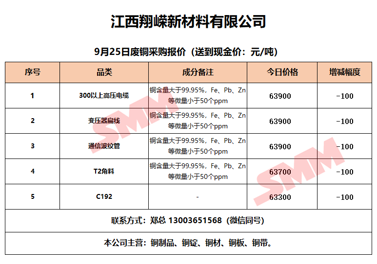 9月25日江西翔嵘新材料 废铜采购报价