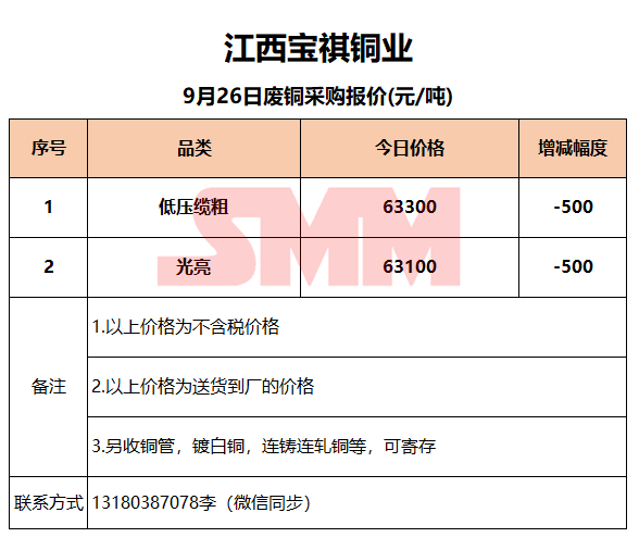 9月26日江西宝祺 废铜采购报价