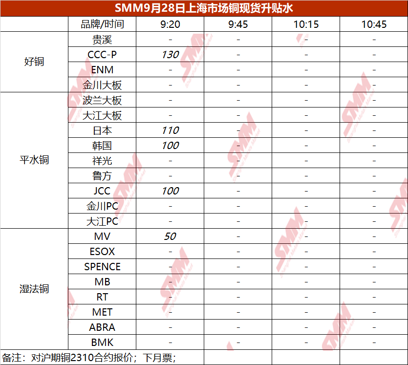 9月28日上海市场铜现货升贴水(第一时段)【SMM价格】