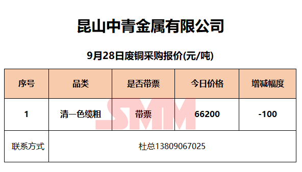 9月28日昆山中青 废铜采购报价