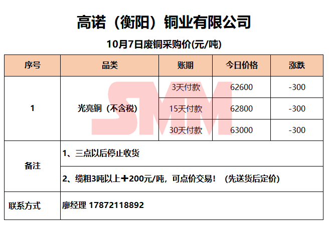 10月7日高诺(衡阳)铜业 废铜采购报价