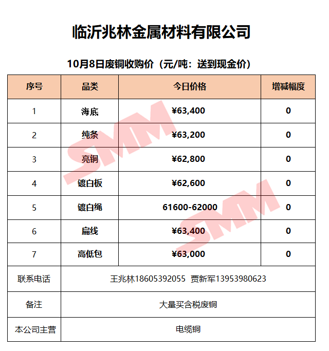 10月8日临沂兆林金属 废铜收购报价