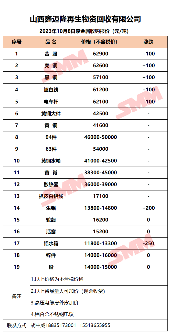 10月8日山西鑫迈隆 废金属收购报价
