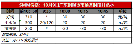 10月9日广东铜现货市场各时段升贴水(第四时段10:45)【SMM价格】