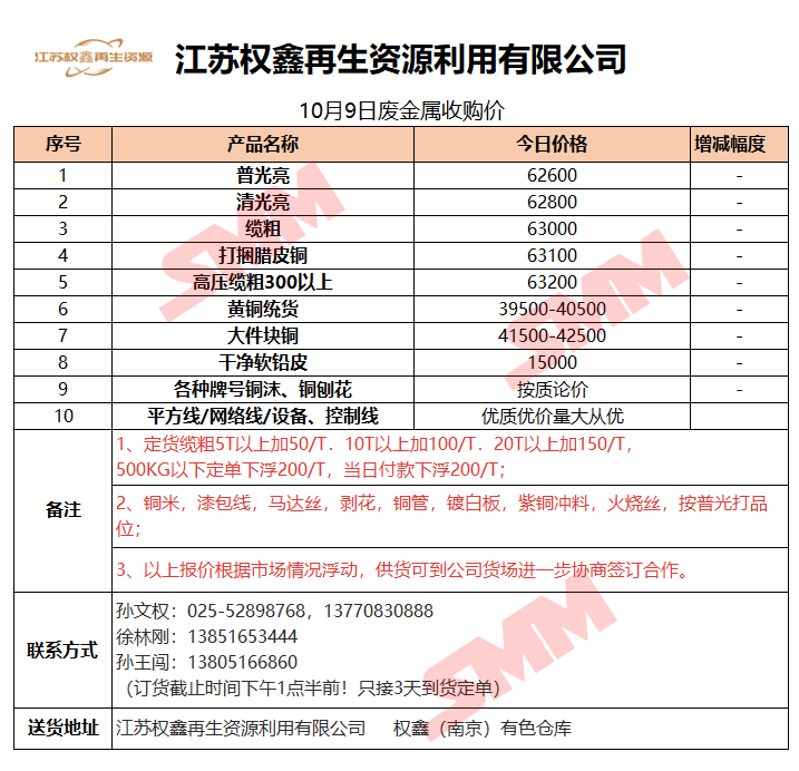 10月9日江苏权鑫 废金属收购报价