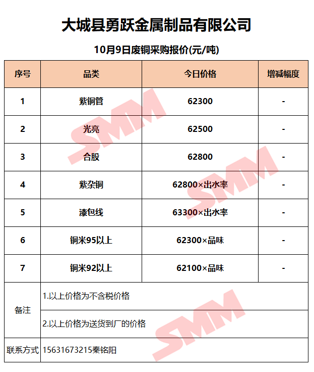 今日大城勇跃,废铜采购报价已更新,有货的朋友欢迎联系我们!