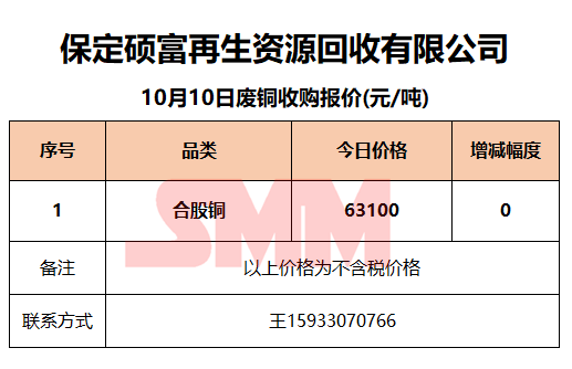 今日保定硕富 ,废铜收购报价已更新,有货的朋友欢迎联系我们!