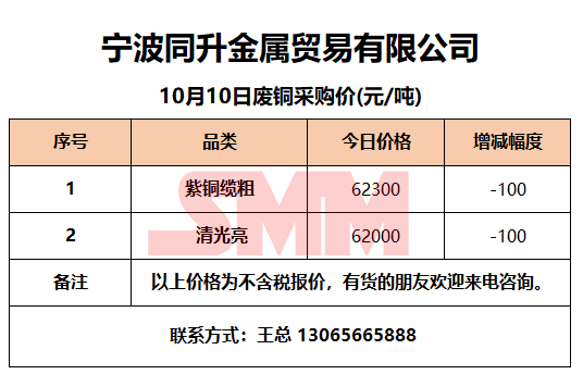 今日宁波同升金属,废铜采购报价已更新,有货的朋友欢迎联系我们!