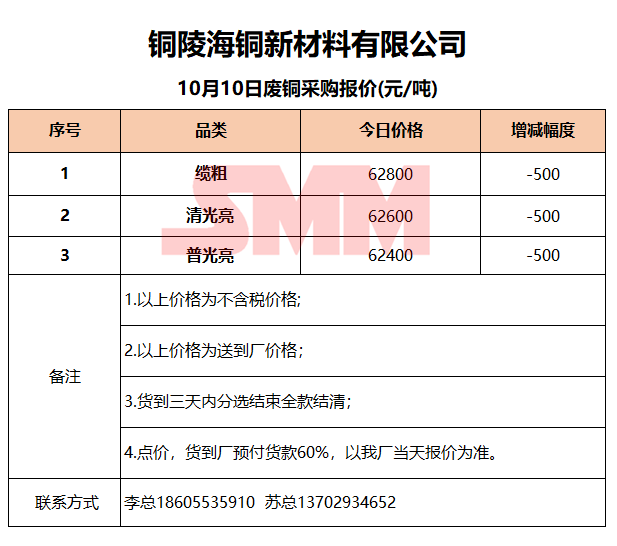 10月10日铜陵海铜 废铜采购报价