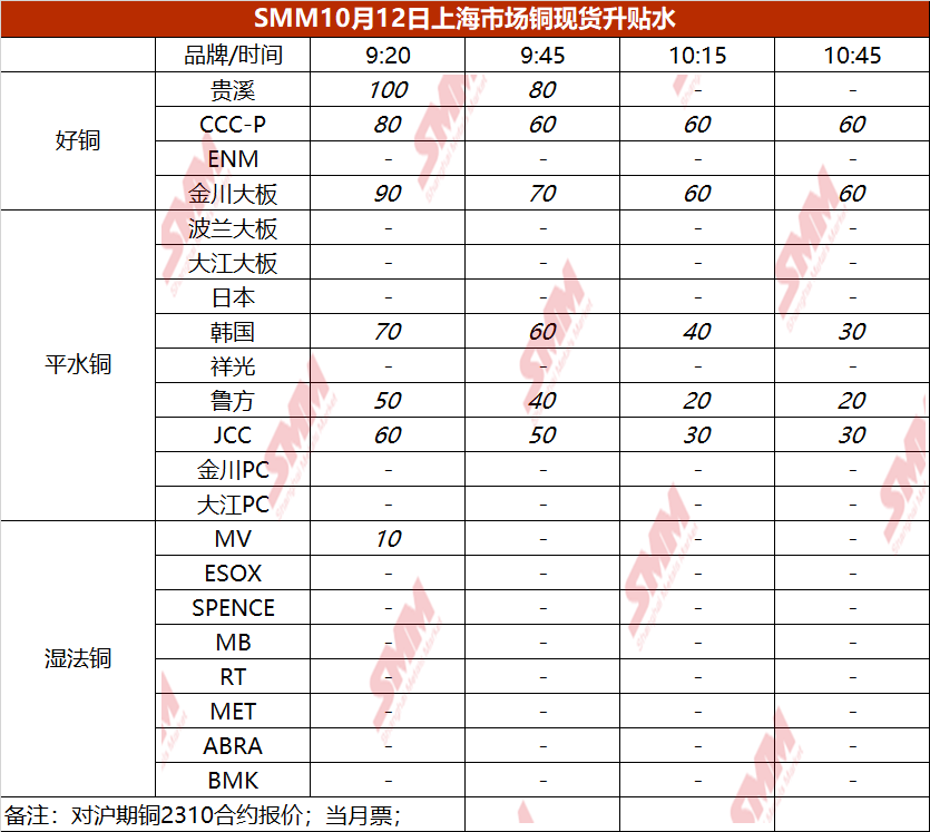 10月12日上海市场铜现货升贴水(第四时段)【SMM价格】