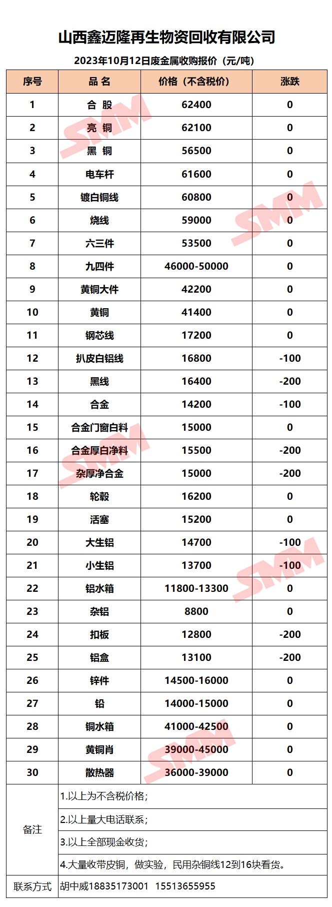 今日山西鑫迈隆,废金属收购报价已更新,有货的朋友欢迎联系我们!