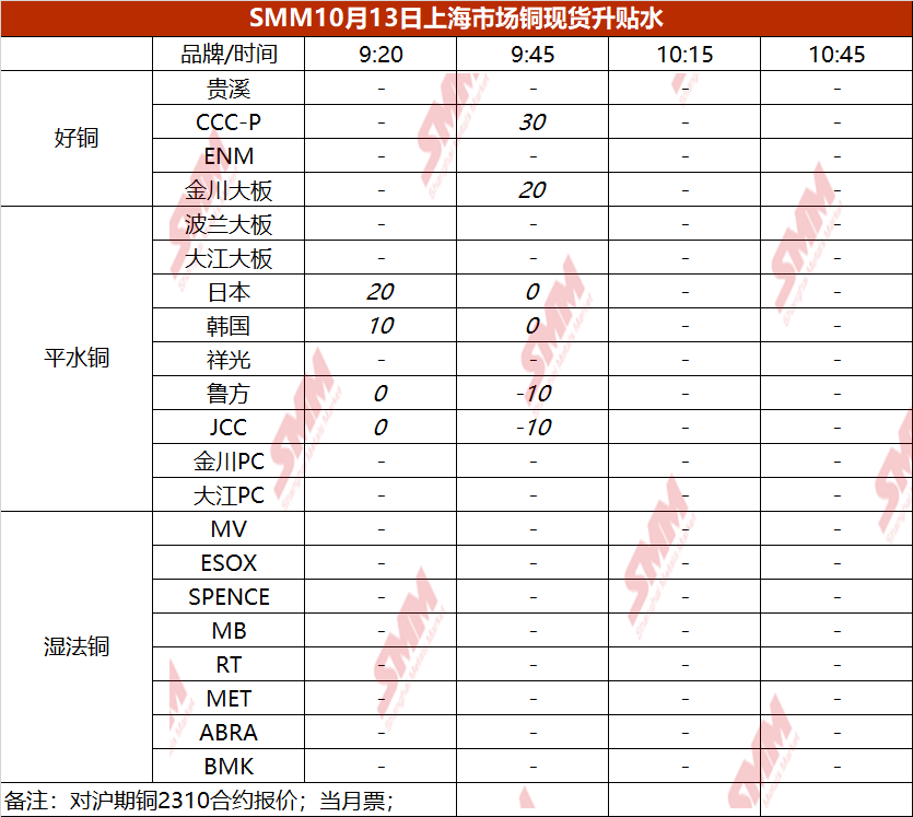 10月13日上海市场铜现货升贴水(第二时段)【SMM价格】