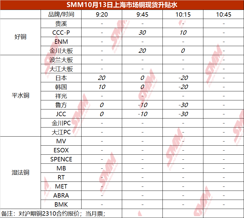 10月13日上海市场铜现货升贴水(第三时段)【SMM价格】