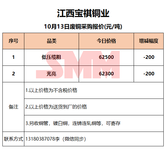 10月13日江西宝祺 废铜采购报价