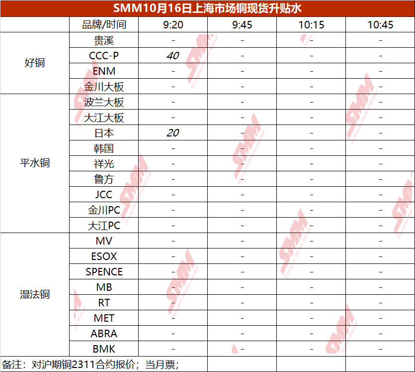 10月16日上海市场铜现货升贴水(第一时段)【SMM价格】