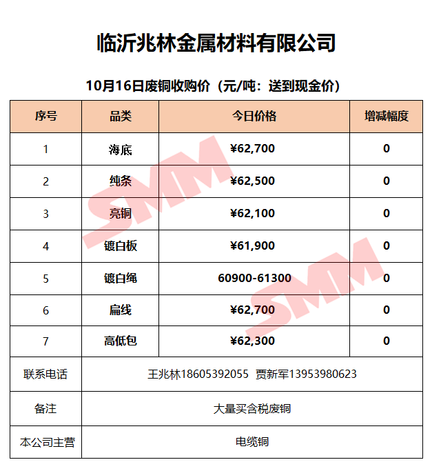 10月16日临沂兆林金属 废铜收购报价