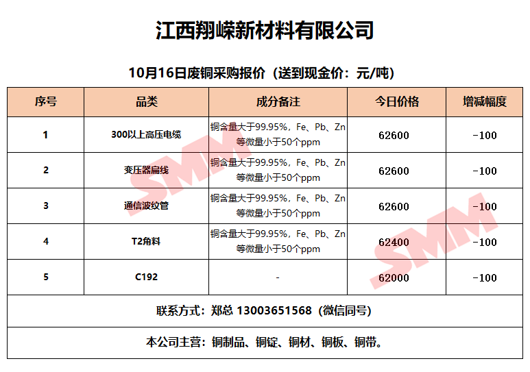 10月16日江西翔嵘新材料 废铜采购报价