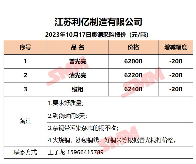 10月17日江苏利亿 废铜采购报价