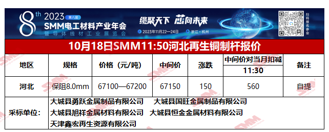 10月18日SMM河北地区再生铜制杆报价