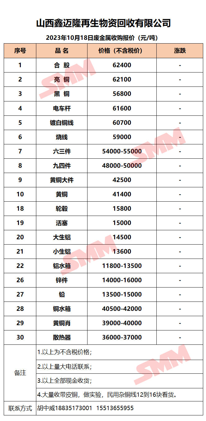 10月18日山西鑫迈隆 废金属收购报价