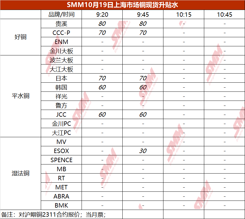 10月19日上海市场铜现货升贴水(第二时段)【SMM价格】