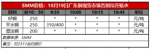 10月19日广东铜现货市场各时段升贴水(第一时段9:30)【SMM价格】