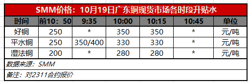 10月19日广东铜现货市场各时段升贴水(第三时段10:15)【SMM价格】