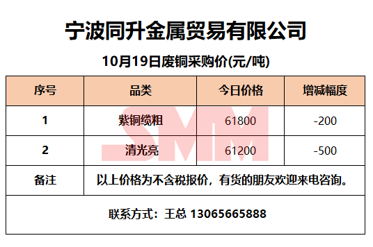 10月19日同升金属 废铜采购报价