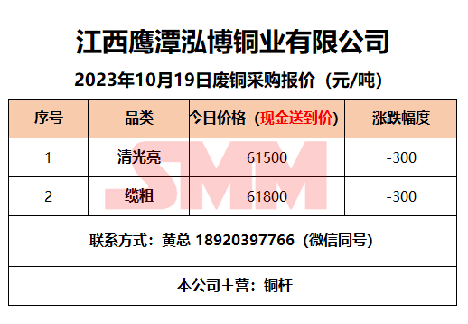 10月19日江西鹰潭泓博铜业 废铜采购报价