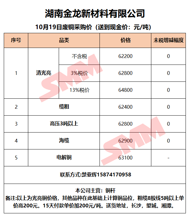 10月19日湖南金龙 废铜采购报价