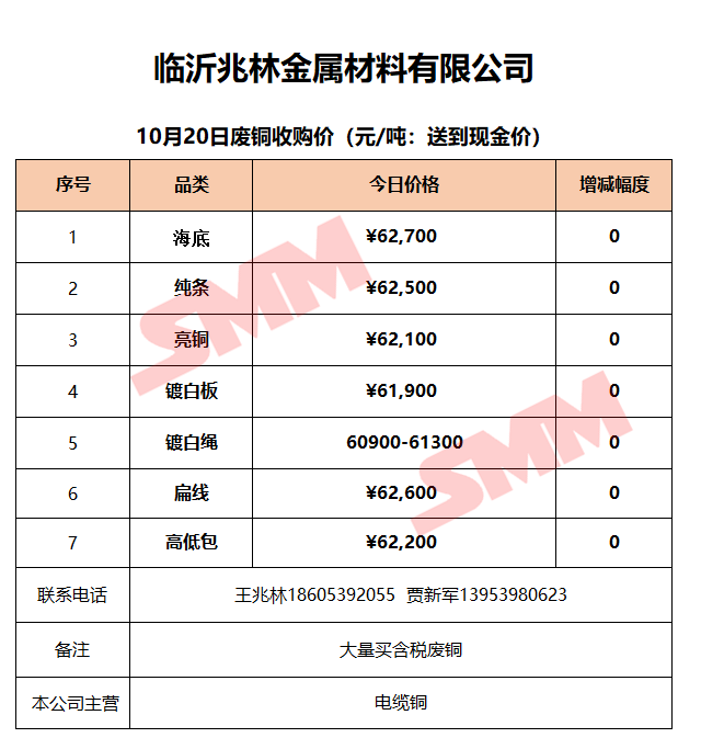 10月20日临沂兆林金属 废铜收购报价
