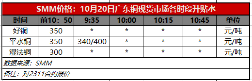 10月20日广东铜现货市场各时段升贴水(第一时段9:30)【SMM价格】